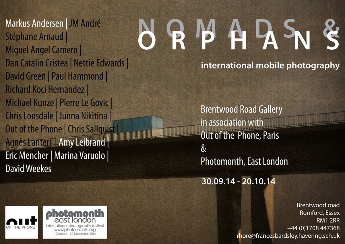 "The Brentwood Road Gallery presents a truly international exhibition of Iphoneography and Mobile Photography, featuring 20 photographers who use only their smart phones to capture and edit their photographs. In collaboration with Out Of The Phone and photographic pioneers, the gallery will examine the dissolving ontology of the photograph in the wake of the digital-social revolution - the democratisation of art and subversion of the art market's reliance upon the unique artistic image and its limited dispersal. With photographers from Stuttgart, Paris, London, Seattle, Philadelphia, Mexico City, Moscow and, of course, Romford, come along to the opening night of NOMADS & ORPHANS @ Brentwood Road Gallery on Tuesday 30th September 5 - 8 pm."